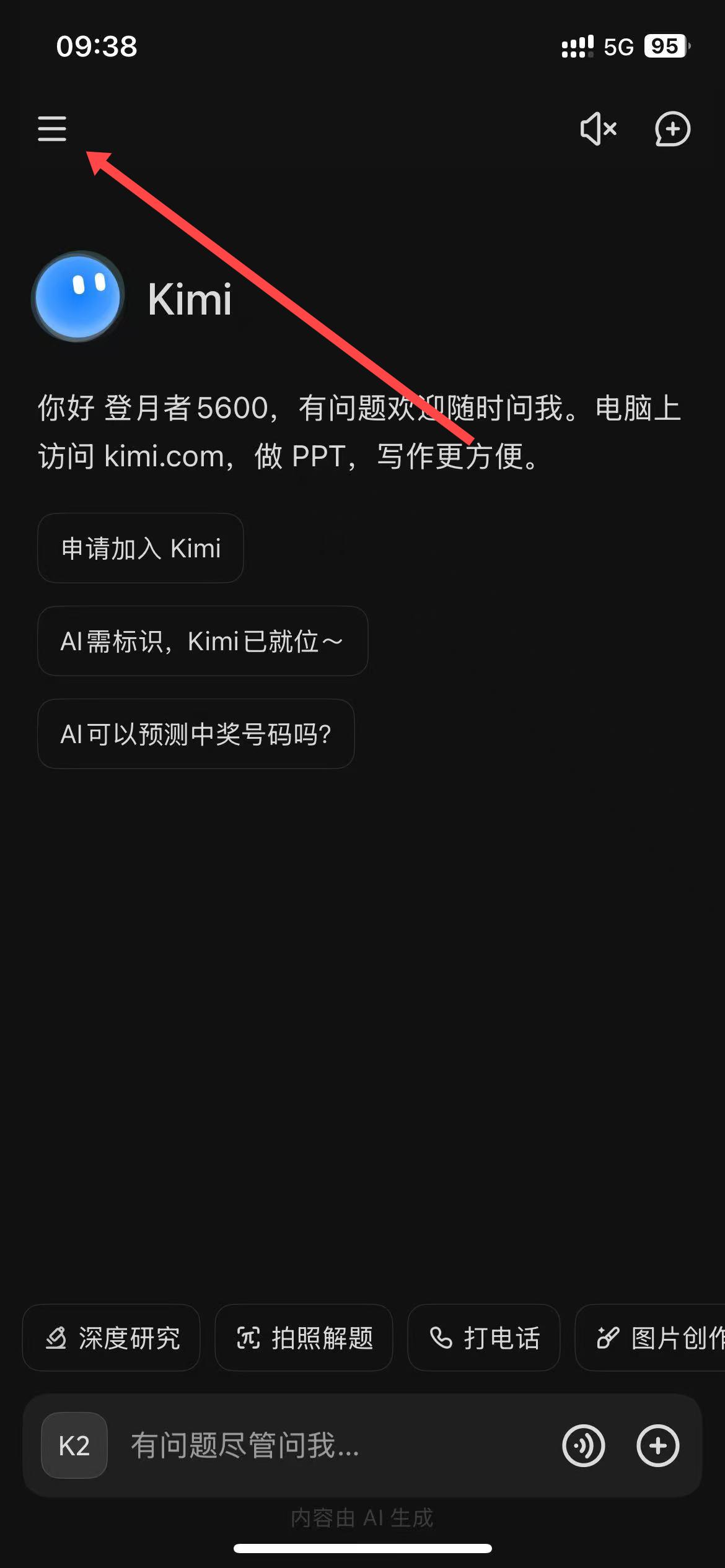 1、打开Kimi智能助手,点击界面左上角三条横线的菜单图标,调出侧边栏。