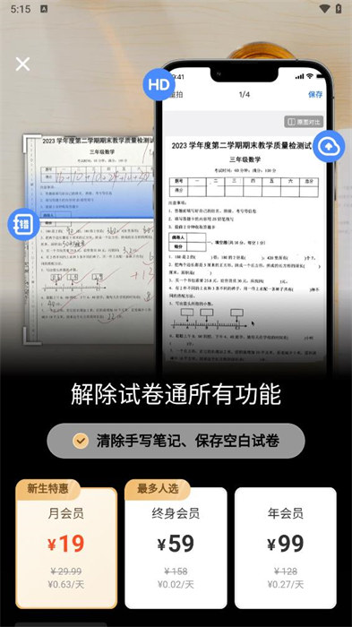 3、手机清除自己的功能能自动识别并清除试卷上面的自己,快速还原空白试卷;