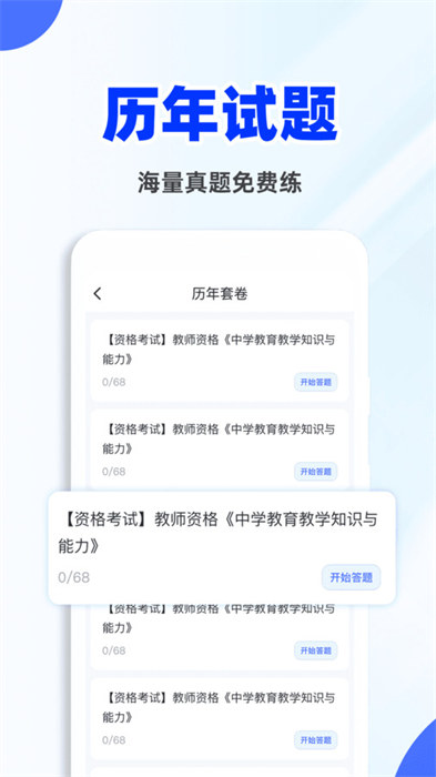 教资刷题宝app是一款十分好用的教育学习类软件,是一个专门为了用户进行学习知识的软件,为用户提供了许许多多丰富的学习模块,让用户可以随时满足自己的学习需求,可以帮助用户们进行学习刷题的工具,其中有十分丰富的模块可以选择,多种题库的资源可以满足不同用户们的需求。