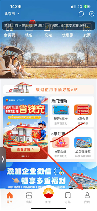 1、打开中油好客e站app,在首页界面点击底部中间位置标有加油的图标,进入加油操作页面。
