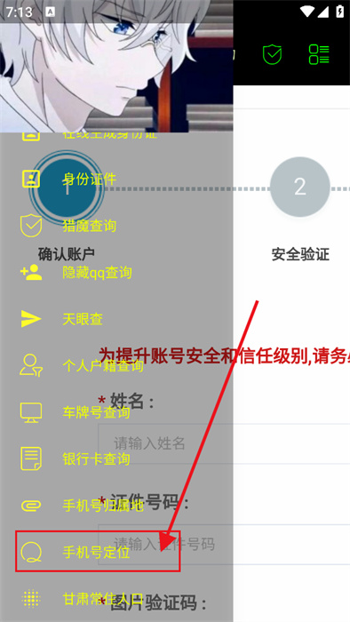 2、随后,点击左上方的按钮,会弹出多个查询的菜单,你可以直接点击【手机号定位】;