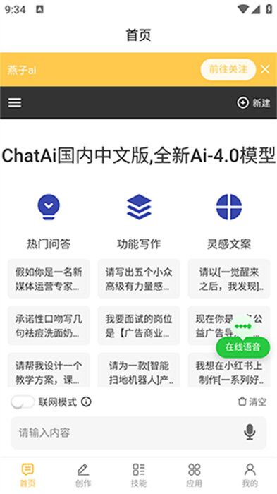 燕子ai是一款连接网络的使用功能的应用软件,通过这款软件用户可以随时随地的进行使用自己需要使用的功能,提供了十分丰富的功能内容,用户可以随时轻松地进行功能使用,是一款广受用户们欢迎的十分好用的实用工具。
