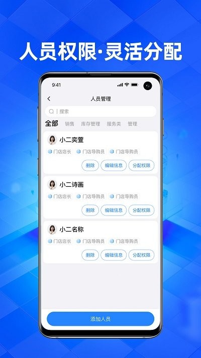 5、在功能上根据人员的身份权限进分配,实现门店多位员工的线上权限管理;