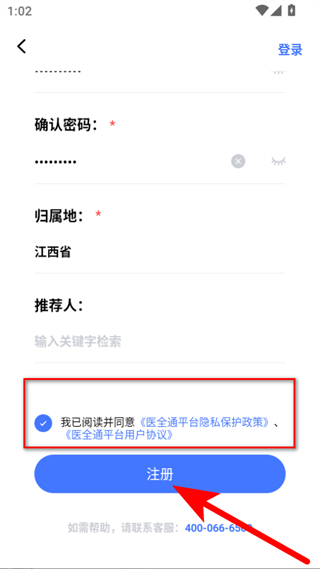4、勾选我已阅读并同意医全通平台隐私保护政策、医全通平台用户协议后,点击注册按钮,即可完成账号注册操作。