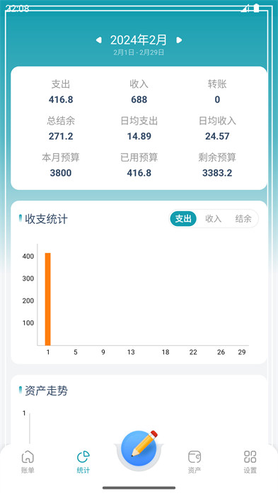 1、支持年、月和自定义周期的收入支出的统计和资产走势,一级分类和二级;