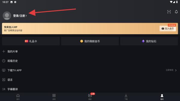 2、进入主页内,点击登录/注册的区域。