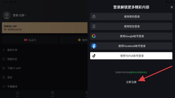 3、在右侧弹出的登录方式中,找到并点击立即注册的按钮。