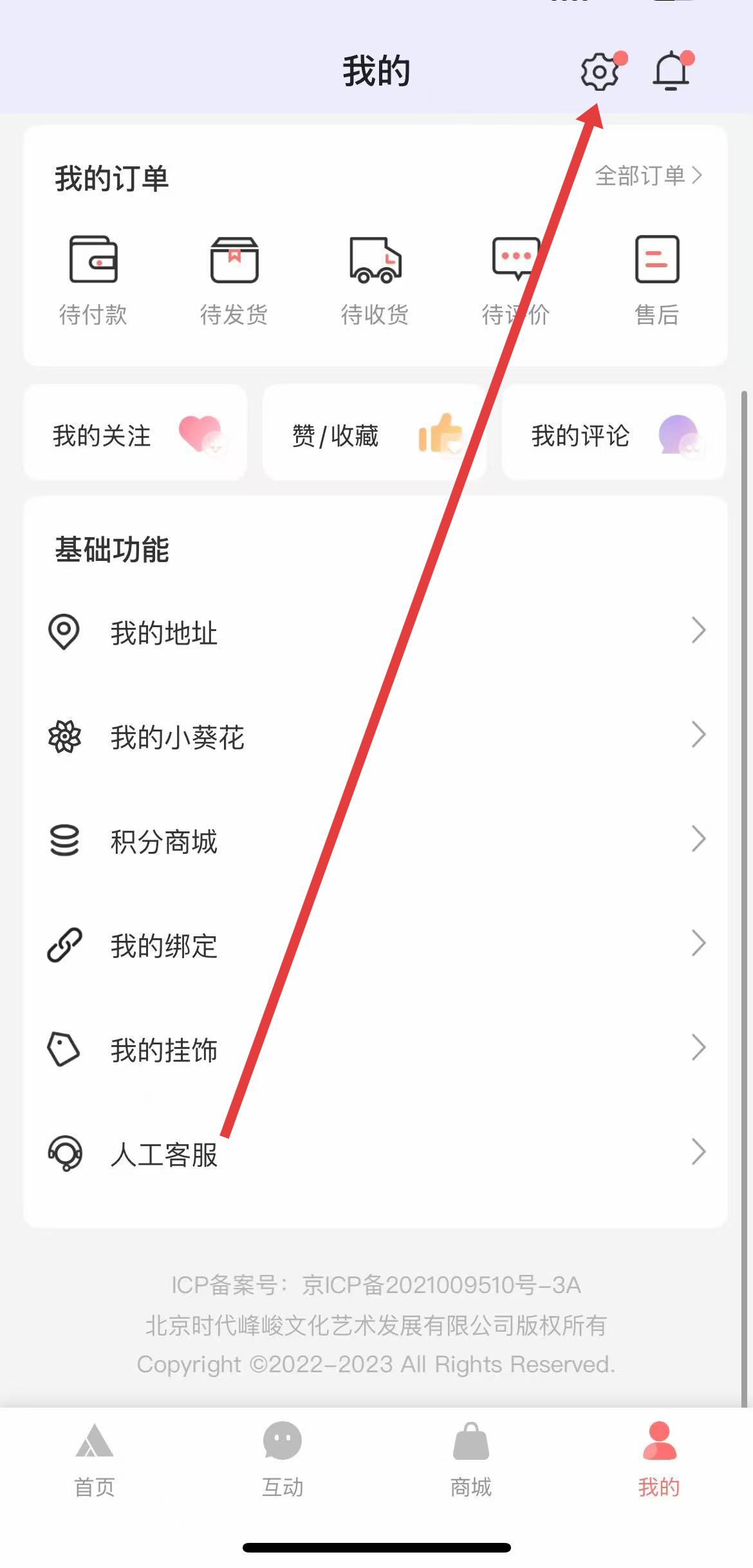 1、打开时代峰峻fanclub软件后,进入我的页面,点击右上角设置图标进设置页面。