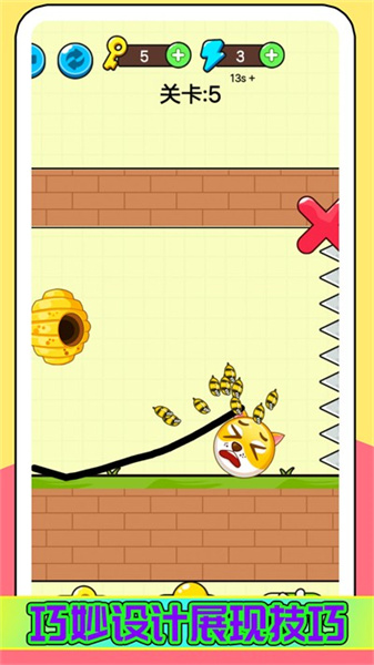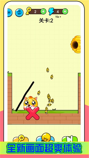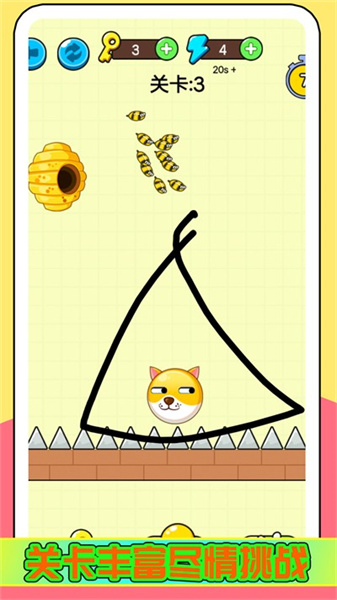 极限偷生是趣味十足的画线解救游戏,玩家需要在关卡里面,通过画出顺利的路线来帮助玩家来过关,帮助狗狗顺利的避开蜜蜂的叮咬,完成关卡的任务,解锁全新的关卡,让玩家发挥自己的脑洞来过关,快来体验下。