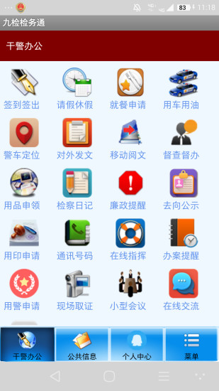 1.具备手机签到,手机签退,请假销假,就餐申请,用车申请,警车定位,对外发文,移动阅文等功能。