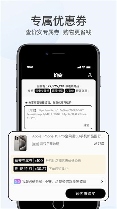 价安app是一款基于大模型技术的价安提供先进的商品推荐、比价和砍价服务的应用,全网比价为用户们推荐最优惠的商品购买的店铺,可以查找自己想要购买的商品的优惠券去领取享受到更便宜的商品的价格,轻轻松松的购买到自己所需要的商品,还可以使用AI砍价的模式替用户和商家进行砍价。