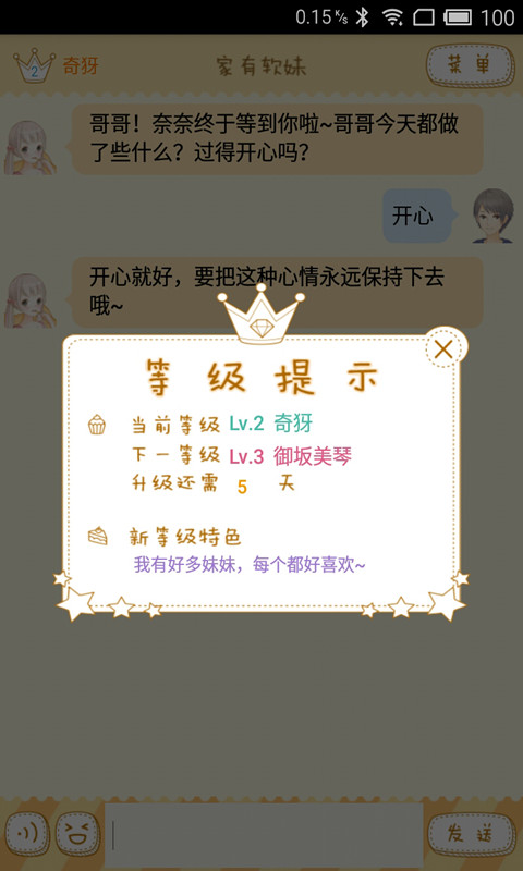 家有软妹是一款萌妹子陪你聊天的游戏,打开软件就会有一个萌妹子奈奈等着你,她可以像一个真的妹纸一样陪你聊天,还不会担心聊崩了的情况出现,并且她还可以用语音回答你哟,完全是男生们的福利啊,除此之外,家有软妹的界面设计十分良心,奈奈酱的造型也非常棒,如果还是不能吸引你,那么可以看一看软件的截图,你一定会动心的,感兴趣的人快来下载使用吧!