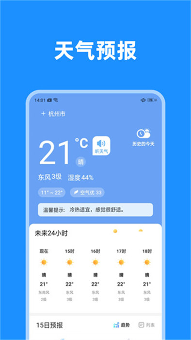 一览天气app是一款查看天气信息内容的应用,经过了精心的处理和分析确保了天气预报的准确性和权威性,通过先进的算法和智能的分析,应用能够根据用户们的地理位置、偏好和习惯为用户们推荐最符合其需求的天气信息的内容,还拥有简洁明了的界面设计和流畅的操作体验,轻松的浏览天气信息。