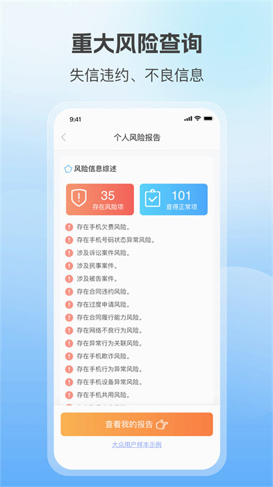 4、快速的查询个人风险的报告信息内容,及时全面的掌握到用户们自身信誉状况。