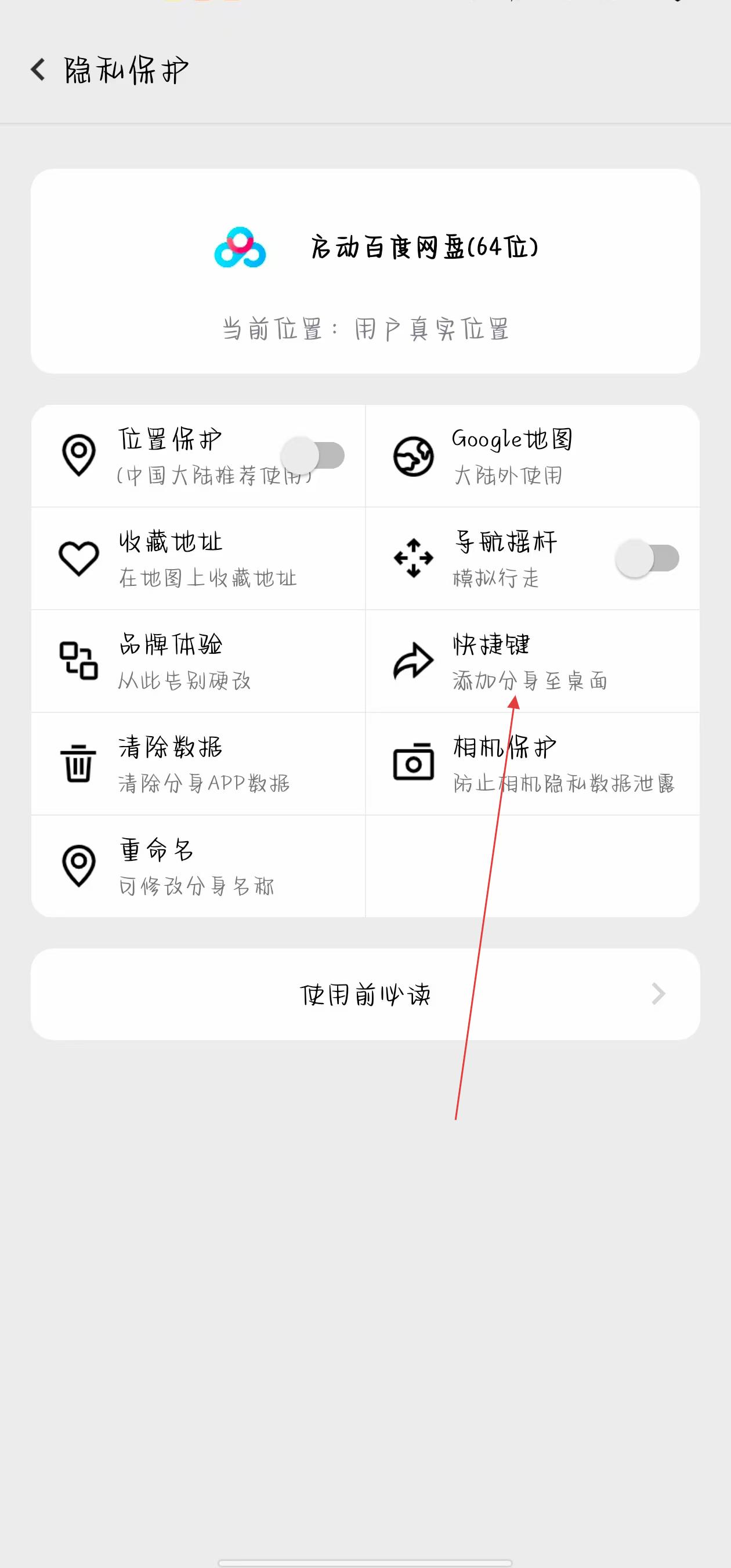 2、进入应用分身的隐私保护界面后,找到并点击快捷键,添加分身至桌面选项。