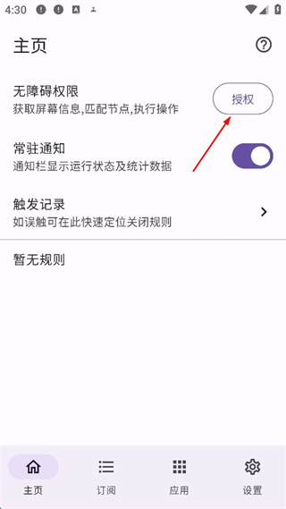 1、在APP主页点击“无障碍权限”旁的“授权”按钮。