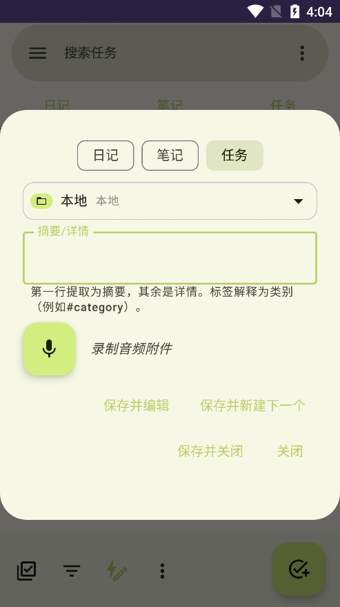 任务笔记软件是一款操作简单的优质笔记软件,整体的操作方式完全不困难,你可以在生活和学习的任何时间打开记录,十分的便利,同时软件内的所有笔记都会按照规律保存下来,这样任何时间查找都会非常轻松,并且记录的页面都能调整和更换,你可以导入专属的背景来查看,这样就增加了自己日常记录的兴趣,并且还能定时提醒,不错过让自己的任何计划,日常有这方面需要的小伙伴快来下载吧!