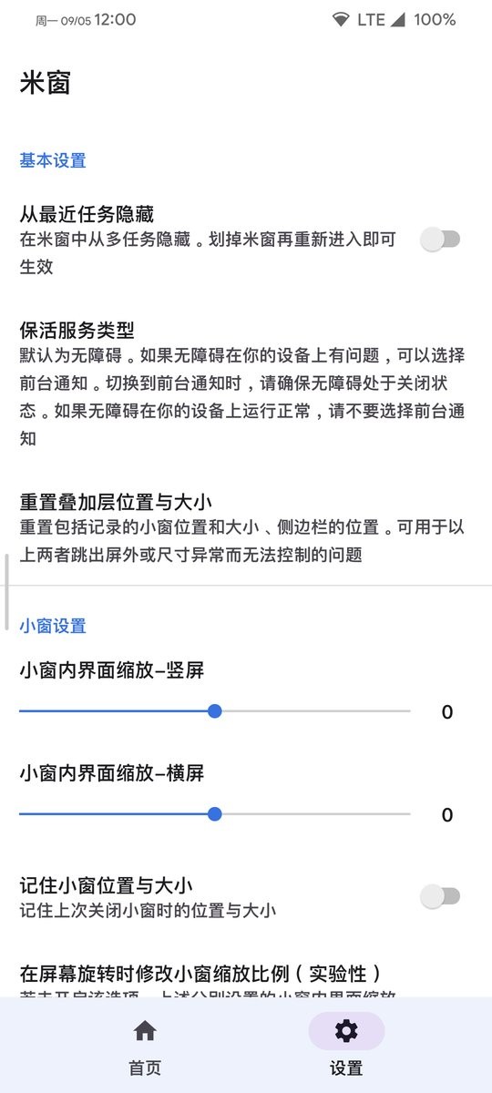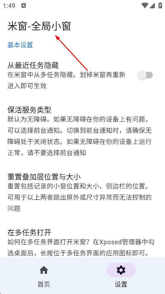 3、在设置页,浏览基本设置内容,按需调整“从最近任务隐藏”等功能,完成米窗个性化配置。