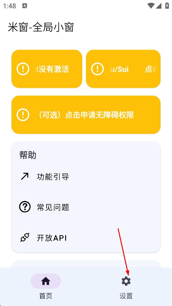 2、来到米窗主界面,点击底部“设置”,进入设置页面,查看权限激活状态与功能引导选项。