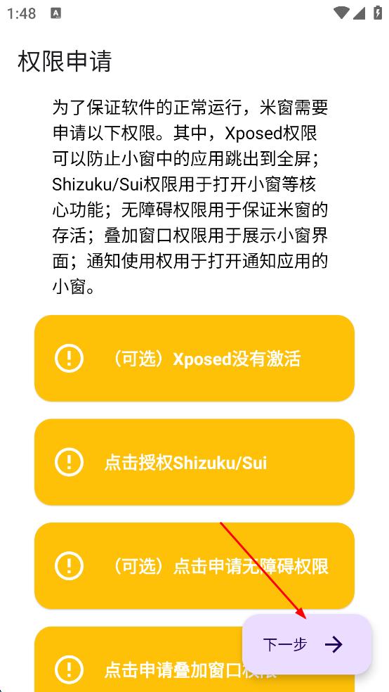 1、进入权限申请页,阅读权限说明,按需求处理可选权限,点击“下一步”,推进权限申请流程。