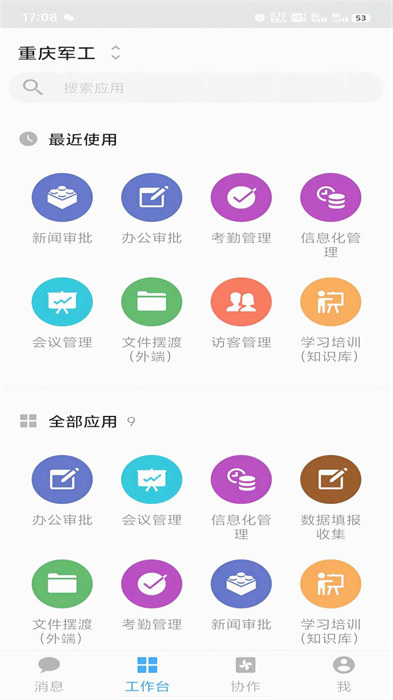 重庆军工是一款企业移动办公的平台,支持企业通讯和协同办公等功能内容于一体的软件,十分高效的处理日常的工作内容,轻轻松松的进行沟通交流的操作,让用户们的日常办公可以变得更加的高效,有需要的用户们可以直接下载。
