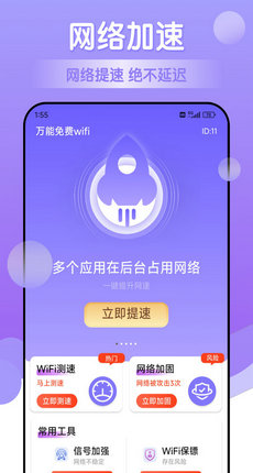 万能免费wifi软件是一款非常实用的手机辅助工具,日常网络的运行速度都能准确估算,并能了解到更全面的辅助功能,如优化网络、自动检测等等,全部都能在线选择使用,并且软件内的这些工具完全免费,无需你繁琐的进行付费,如果你也想了解当前网络的最新情况,一定要来这里体验一下!