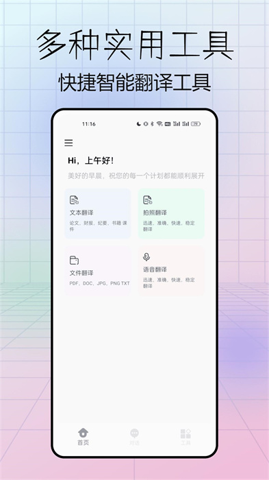LectMate是一款功能内容十分强大的应用,为用户们提供了多方位的翻译服务的内容,首页集合了各种各样的功能内容,满足了更多用户们在不同场景下面的翻译需求,在对话的页面用户们可以根据不同的场景选择对应的翻译的模式,实现了实时而又准确的交流操作,还拥有十分丰富的工具资源。