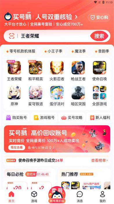 买号鹅是一款交易游戏账号的应用,交易起来会更加的放心,涵盖了手游、端游和Steam等全品类游戏交易的操作,提供了买号、卖号和账号回收等一系列十分专业的游戏服务的内容,拥有很多热门游戏的账号交易,比如说王者荣耀、和平精英、元梦之星和原神等各种热门游戏账号都是应有尽有的。