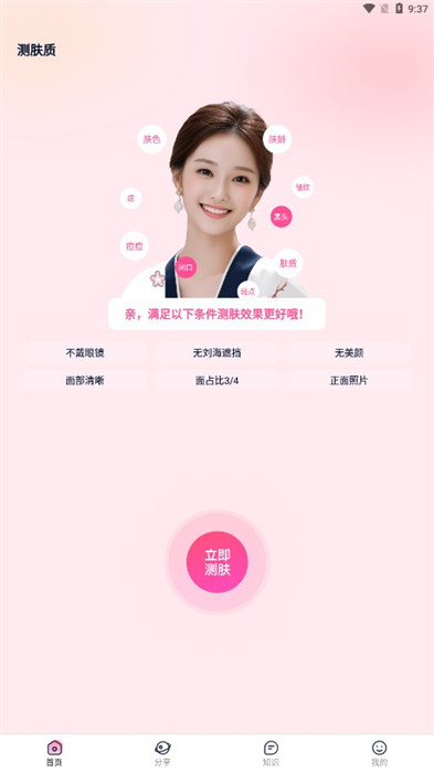 测肤质app是一款用手机就能测肤质的软件,提供了十分专业的肌肤测试的功能内容进行智能的分析,查看到肤质的测试报告的内容,拥有十分丰富的护肤秘诀,让肤质的测试可以变得更加的轻松而且护肤也能更加的省心哦。