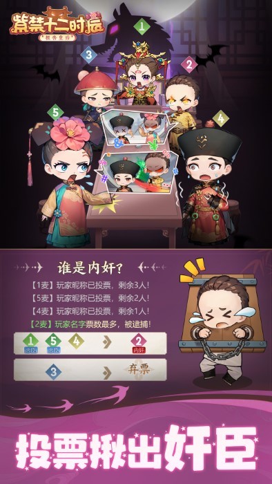 紫禁十二时辰游戏是一款以狼人杀为主要玩法的游戏,在对于阵营的分配上以古代背景的职业进行划分,在通过不同的职业与玩家们进行挑战,各自为营的挑战带来了更多全新的特色化玩法,并且玩家们也将会在十二个时辰内找到内奸就算挑战成功,反之就是挑战失败,所以在对于游戏场景的故事不断变化下,也将会感受到更加具有趣味性的游戏体验,将在这里感受不一样的休闲益智类的推理挑战。