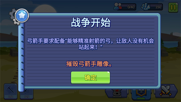 3、战争开始,弓箭手要求配备能够精准射箭的哦弓,让敌人没有机会站起来,目标为摧毁弓箭手雕像;