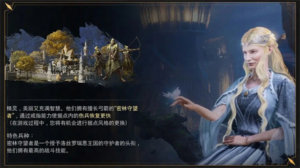 在建立自身势力时,我们可以自由选择刚铎的人类、洛丝罗瑞恩的精灵和埃瑞博的矮人三个种族之一的建筑风格。不同的风格将有各自的主城外观,开局时也将得到不同指挥官的帮助。但无论初始选择如何,都有机会搜集所有指挥官。他们分别是强力的骑兵指挥官——拥有迅速的行动力与强力的输出能力的伊奥梅尔、优秀的辅助指挥官——拥有可观的治疗与减伤能力的精灵公主阿尔玟和强壮的矮人战士——拥有强力的爆发力与破坏力的吉姆利。
