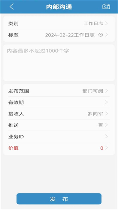 2、发布自己工作信息内容的日志,记录下用户们自己的工作内容去进行查看;