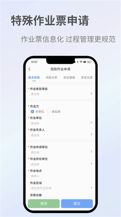 4、作业票信息化的过程管理会更加的规范化,及时的发现到隐患高效的去控制。