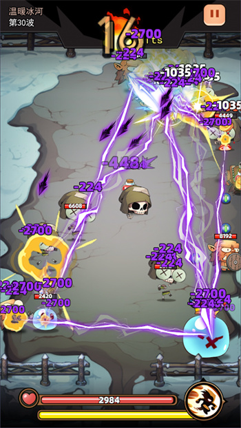 1、【技能发射】不同的战局画面里都具有不同的战争冒险战场,不断的发射自己的技能向敌人发射自己的招式,将一个个的怪物打败;