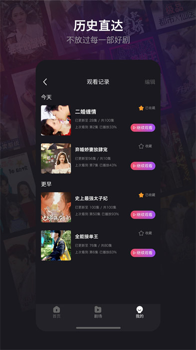 ②、观影历史,每天你在线上的追剧历史非常的丰富,能中断之后再次追剧;