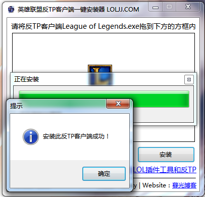 lOL-AntiTP Loader(LOL反TP一键安装器)可以自动为您安装英雄联盟反TP客户端,您只需要将下载好的反TP客户端文件拖入此程序,点击“安装”即可完成反TP客户端的替换。