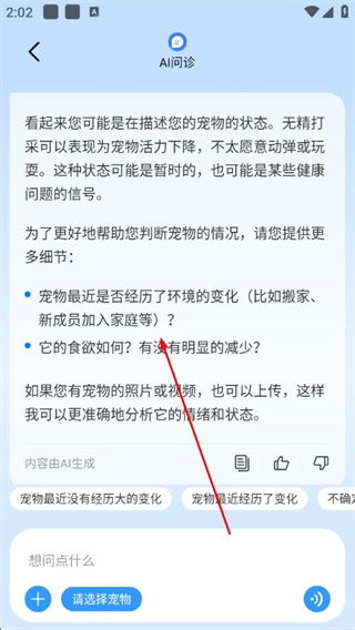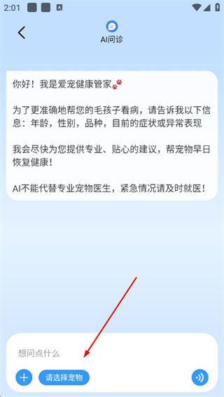 2、在AI问诊页面的输入框中,描述宠物的症状。