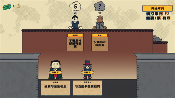 3、你只能使用仅有的金币去购买陪审团,尽可能的达到自己的目的,这样才能全审判;