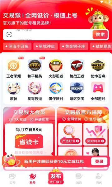 交易猴论坛软件是一款可以实现游戏账号快速线上交易的平台,在对于如今的各种游戏层出不穷的情况下,对于一些游戏的卡池角色和武器、皮肤的抽取上需要氪金抽取,如果有喜欢的东西没有抽取到但是绝版时,玩家们都会找寻线上账号交易平台,找寻是否有自己喜爱的账号可以交易,该平台就提供给用户们一个更加安全的线上交易安全保护,带来了超多游戏的账号交易一起来看看有哪些游戏账号可以选择吧。