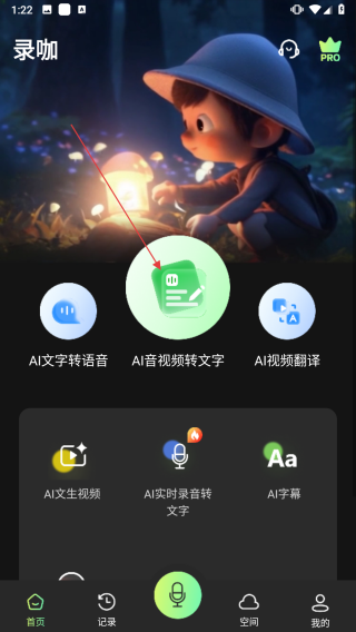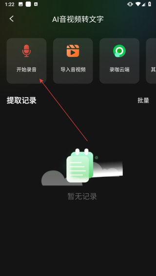 1、打开录咖APP,在首页点击AI音视频转文字功能图标,进入对应操作页面。