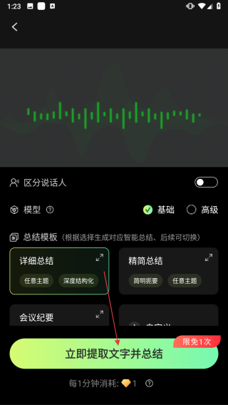 5、点击立即提取文字并总结按钮,选择总结模板等参数,即可让系统对录音进行文字提取与总结。
