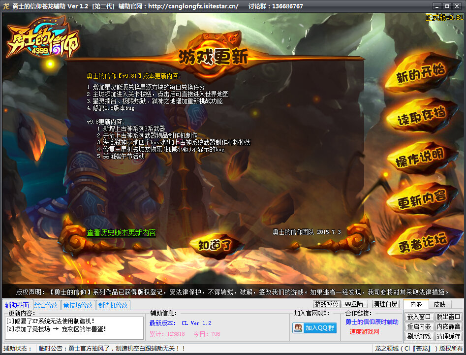 勇士的信仰苍龙辅助二代是一款多功能的《勇士的信仰》辅助修改器工具。软件功能异常强大,可以提供全屏攻击、一键秒杀、物品无限(一键9999999物品)、一秒过图、人物无伤等功能,是玩家玩《勇士的信仰》的必备神器啊!赶快下载体验吧!