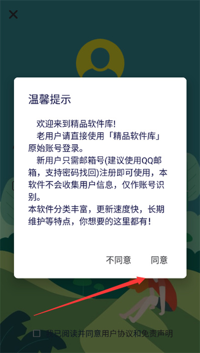 2、在软件注册登录界面,点击【同意】这样就可以同意这些条款,才能正常使用软件;