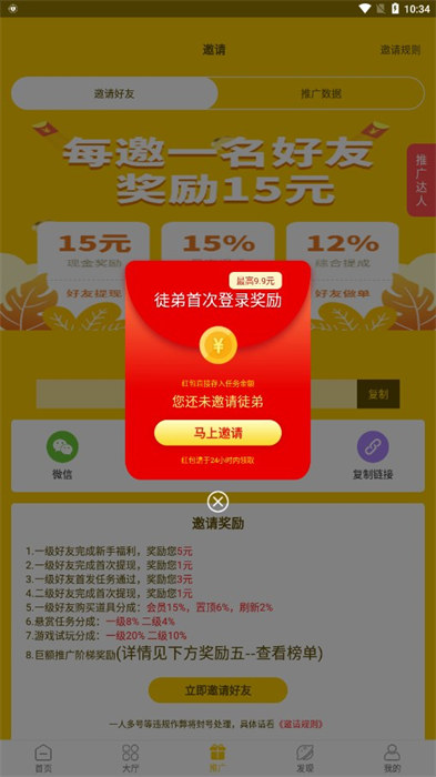 3、邀请自己的好友可以赚取到更多的收益,推广也可以赚取到更多的收益哦;