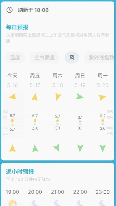 4、分钟级的降水量预报,可以准确的预测到未来两小时是否会下雨以及降水量。