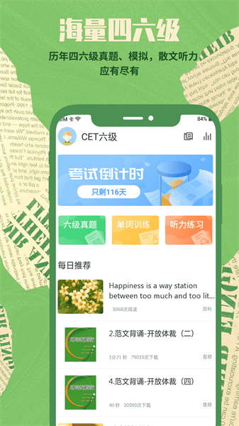 塔塔四六级app是一款专门给考四六级用户专门打造的学习软件,这里能够直接线上制定专属的学习计划,让你的英语练习过程更加有规律,并且软件内能够带来一些书本推荐,随时都能在课外时间也能增强自己的英语能力,并且还有超多的听力训练,致力于提高每个小伙伴的成绩。