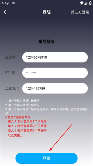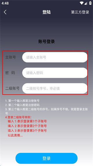 3、在账号登录页面,分别在主账号密码二级账号输入框填写对应信息。