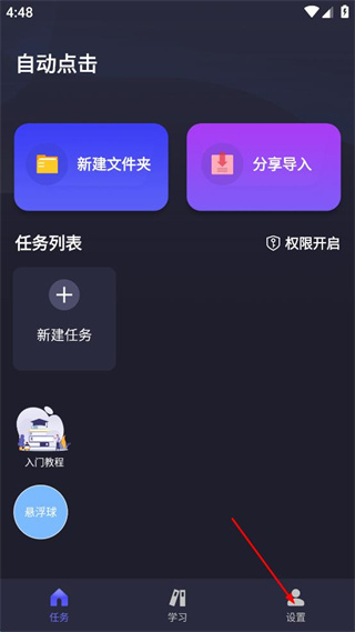 1、打开自动点击软件,进入任务页面查看功能选项,点击底部设置选项进入设置界面。