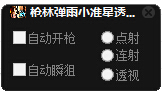 枪林弹雨小准星透视辅助是专为网页游戏《枪林弹雨》打造的辅助工具,为玩家提供点射、自动开枪、自动瞬狙、透视等功能,是玩家玩《枪林弹雨》的好帮手。赶快下载体验吧!